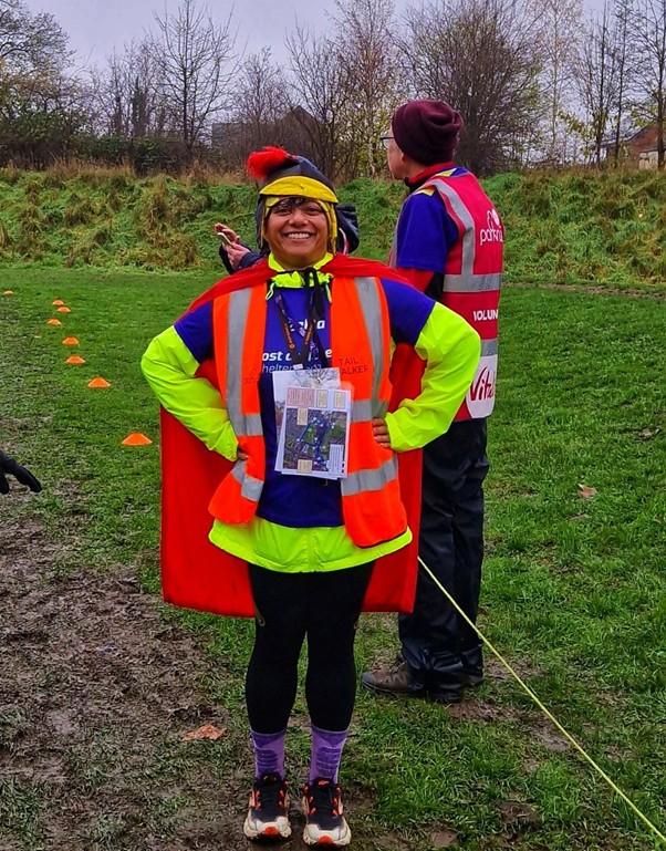 Zakia Hussain notched up her 100th parkrun and wore the traditional Cheltenham centurion cape and helmet: